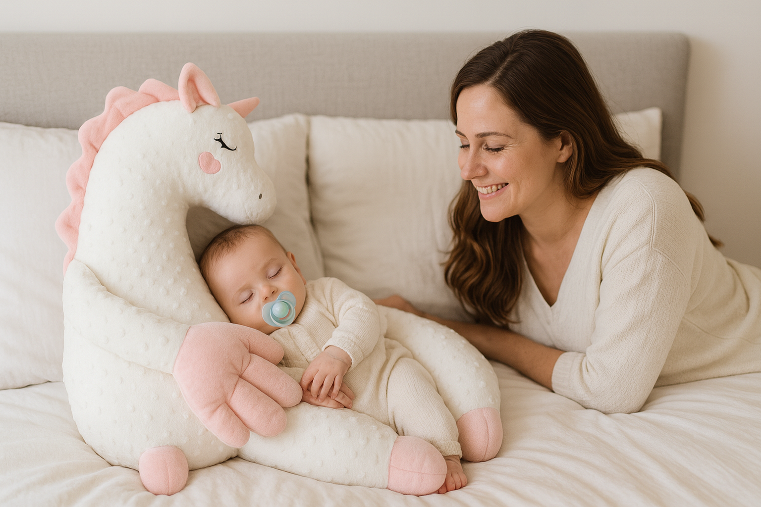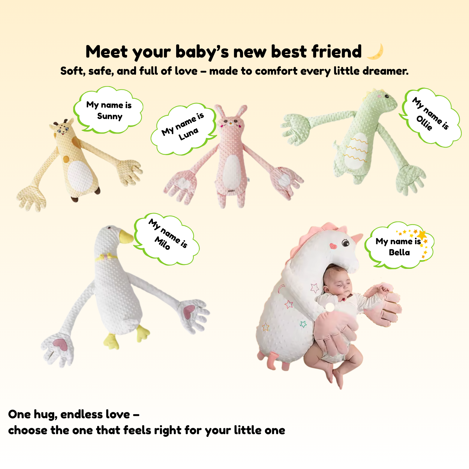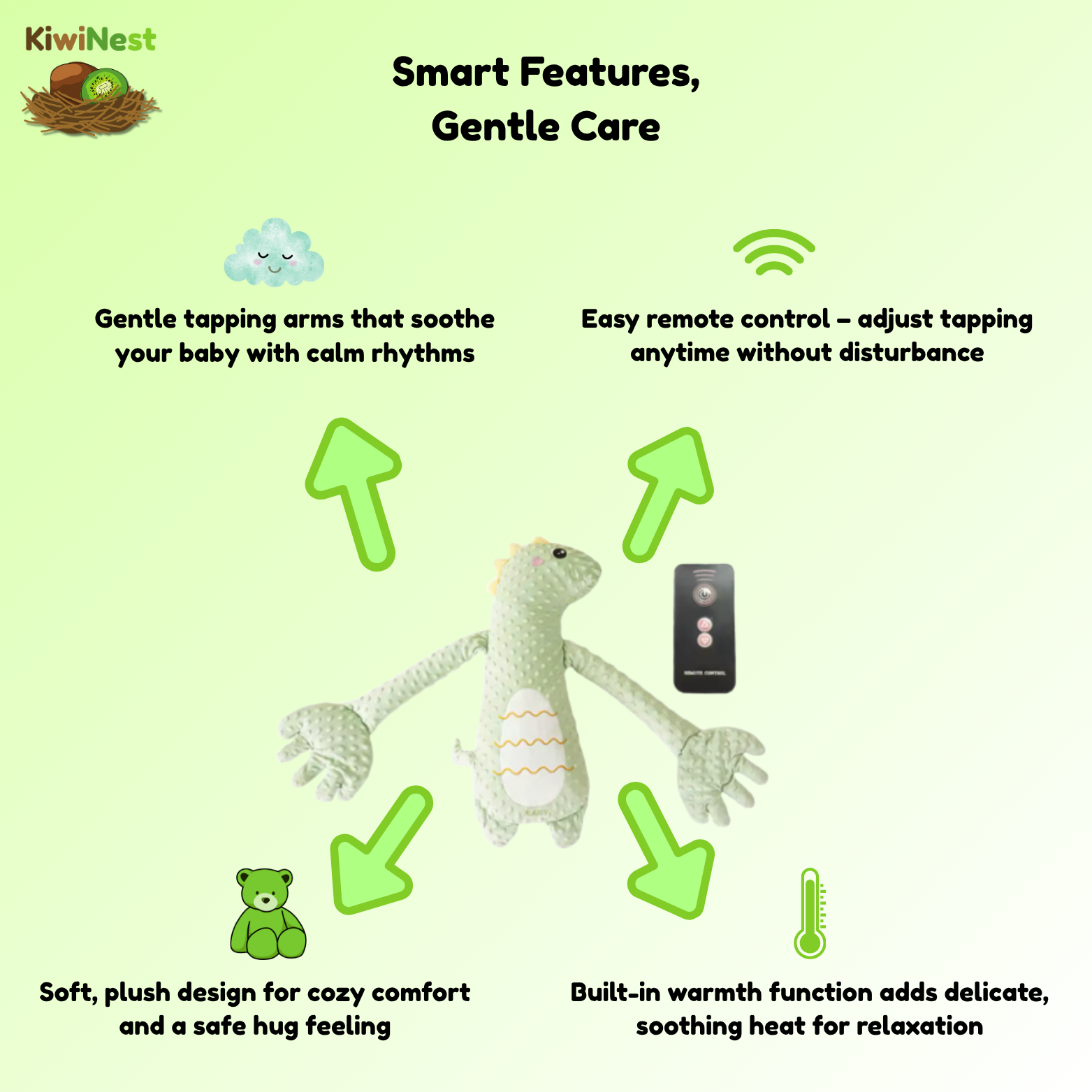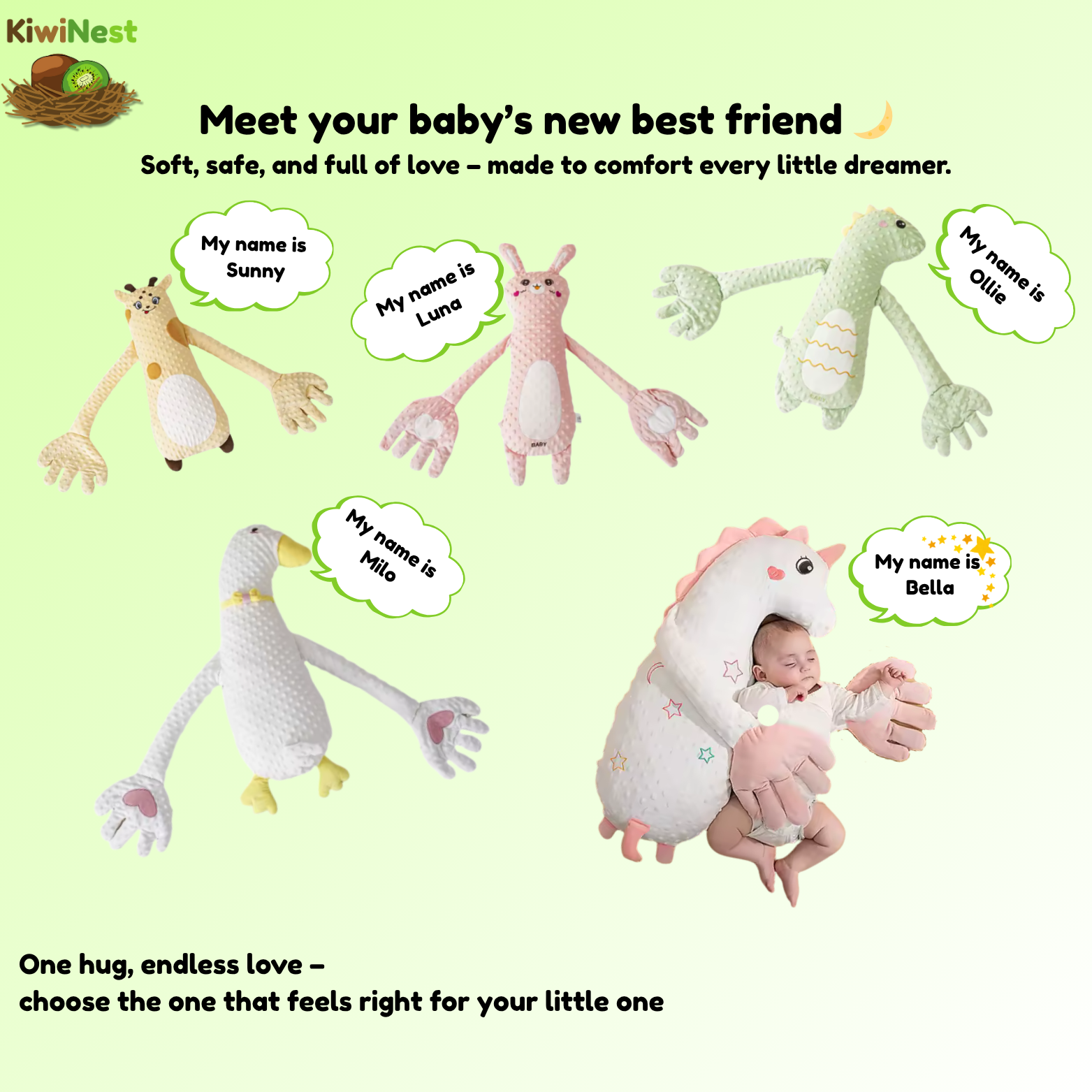 The KiwiNest Snuggle Pillow lies beside your baby and surrounds them with a gentle, steady hug—not a replacement, but an extension of your arms. Breathable plush creates familiar warmth; the calm, adjustable taps tell their little body: It’s okay to rest.